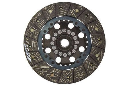 3001202 is a street rigid disc featuring premium organic materials with high copper content for better heat transfer and steel-backed lining for greater burst strength and durability. These discs are modified with reduced marcel for faster shift action to complement ACT pressure plates. The chrome-moly hub is heat-treated for strength and durability. Rivet design and materials are carefully selected for maximum strength. Lightweight, solid-hub design allows for quicker shifting and engagement. ACT's street rigid-hub discs provide race-proven performance with street manageability.