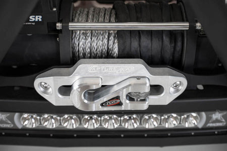 The Capture fairlead system holds your hook in place when not in use, giving you the ultimate form and function. Our hook capture system keeps your hook from dangling outside your vehicle making a clean and low profile front end. Built from 1 5/16" thick CNC machined high quality aerospace aluminum the Capture fairlead is rated for up to 20,000 lbs to help with all your winching needs. Available in raw aluminum or a military grade hard anodized black finish to withstand everyday use. Fits nearly any aftermarket winch front bumper. For synthetic winch rope only.