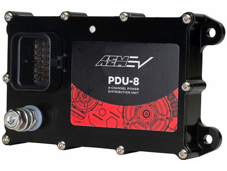 Now available for internal combustion engines! The AEM EV PDU-8 is an eight channel Power Distribution Unit expansion device that gives you the power to program and control various switched devices using our ECU/VCUs, like high-voltage contactors, cooling fans, headlights, brake lights, turn signals, windshield wipers, fuel pumps, and more. The ability to connect up to eight PDU-8s (four on AEM Dashes, and one on Infinity ECU's) on the same CAN bus network lets installers mount the individual PDUs closer to the subsystems they are controlling, which simplifies wiring, reduces weight, and increases reliability. This CAN-based solid-state control module eliminates the need to install fuses and relays for the switched functions that it operates. The PDU-8 can easily be controlled by other CAN based controllers that support custom CAN settings, such as Motec, Link, FuelTech, Haltech, etc. Does work with Holley EFI if using the AEM dash display for logic based control.