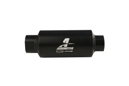 An inexpensive insurance policy to protect your investment, proper filtration is key to fuel system performance. Engineered filter solutions are required to achieve protection with minimum restriction. For 200 ? 3,000 plus HP applications, our filter assemblies offer unmatched flow, ease of installation and maintenance, along with the impeccable machining and finish you?ve come to expect from all Aeromotive components. High flow 10-micron fabric (fine) replaceable element. Flows 2,000 lb/hr with a pressure drop of less than 1 PSI. Compact size: 5.5" long x 2" diameter. ORB-10 ports. Fittings available to adapt these filters to AN-10, -08, and -06 line sizes. All filter assemblies feature an O-ring for positive sealing in high pressure applications. CNC-machined from 6061-T6 aircraft aluminum. Hard-coat black anodized finish for a corrosion resistant, show-car quality appearance. 10-micron filters may ONLY be used after the fuel pump to protect your injectors or carburetor. Fabric elements not suitable for use in E85 or alcohol applications.