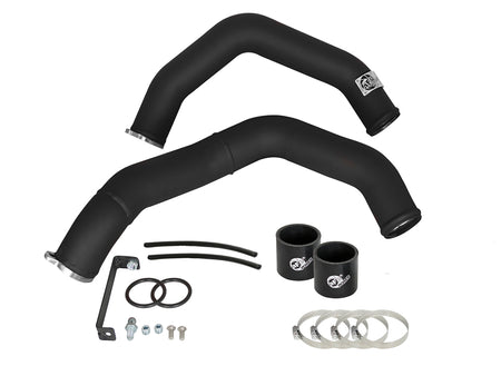 Perfect Fit: Includes stainless steel clamps for a leak-free seal and heavy-duty 5-Ply reinforced silicone coupling for strength.Mandrel-bent Tubing: Constructed of 2-1/4" mandrel-bent aluminum tubing for maximum flow then, powder-coated for a nice finish. The high-temp powder-coating also insulates the tubes from engine heat and protects the tubes from corrosion. The smooth transition bends decrease turbulence, minimize pressure loss, while increasing horsepower and torque. These tubes are also equipped with a billet aluminum factory style adapter that seals with an o-ring. One 1/8" NPT port which is provided on each tube for a sensor or water-methanol injection.aFe Badging: Unique aluminum laser-cut aFe Power logo plate is welded-on for an aggressive style.