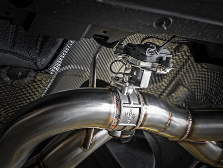 Aggressive Sound: A free-flowing, transverse muffler is used to absorb high pitch tones producing a powerful sound and unleashing all available horsepower and torque. The muffler is finished with a high-temp powder-coated metallic black finish.Exhaust Valve: This Axle-back exhaust system incorporates a factory style exhaust valve which uses the factory exhaust valve motor (not included). The valve helps regulate, direct and control the flow of exhaust gases by opening, closing, or partially obstructing passageways depending on throttle position for maximum performance.Simple Installation: This MACH Force-Xp cat-back exhaust system uses factory mounting locations providing stability and a hassle-free installation.Quad 3-1/2" Carbon Fiber Tips: Finishing off this system are Quad 3-1/2" diameter, carbon fiber tips with an aFe POWER logo.Brushed 304 SS Construction: The performance axle-back exhaust system is constructed of 2-1/2" to 3" mandrel-bent, brushed 304 stainless steel tubing for maximum performance, corrosion resistance and strength eliminating cracking.Emissions Disclaimer: This product does not require a CARB EO#All aFe exhaust systems are engineered and manufactured in our Corona, California facility.