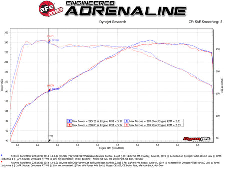This system produced gains of up to +18 HP and +27 lbs. x Ft. TQ., as measured on our in-house dyno. This cat-back exhaust system is constructed of 3" - 2-1/2" mandrel-bent 304 stainless steel tubing for maximum strength and durability. This system features a high-flow stainless steel muffler, producing a aggressive sound. Muffler finish may vary. Finishing off this exhaust system are dual 4" diameter black 304 stainless steel clamp-on exhaust tips. The tips features a laser etched aFe POWER logo for a unique style. Utilizing a factory style flange and hangers this system is a direct bolt-on system, which requires no cutting or modifications for a hassle-free installation. This cat-back exhaust system incorporates a factory style exhaust valve which uses the factory exhaust valve motors (not included). The valve helps regulate, direct and control the flow of exhaust gases by opening, closing, or partially obstructing passageways depending on throttle position for maximum performance. A mitered merge collector is used to decrease turbulence and increase exhaust velocity resulting in increased horsepower, torque and improved throttle response. Utilizing state-of-the-art computer-aided design technology, this exhaust system is designed for custom, high tolerance factory fitment. 100% MIG-Welded for race-proven strength and durability.
