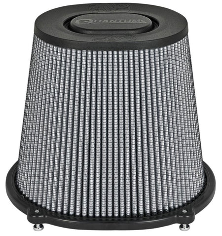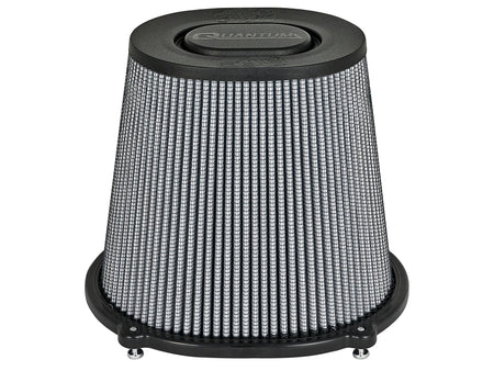 Quantum Pro DRY S air filter by aFe Power is specifically designed for the Quantum Series cold air intake systems and feature an injection molded base and top for lighter weight and rigidity. The newly designed base includes a built-in, 3-angle velocity stack for smooth, even airflow. The Quantum Pro DRY S filter is a 360-degree radial flow air filter with oil-free, 3-layer progressively finer porosity synthetic media for optimum flow, filtration and convenience. Captive screws are included to eliminate lost hardware and to securely fasten to the Quantum Intake system housing.