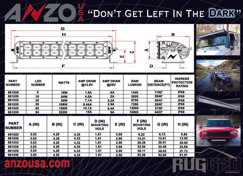 Rugged Vision, Off Road LED Light Bar, Rectangle, 20 In., 3W, High Intensity LED, . IP68 Rated, Can Be Submerged Up To 3 Meters. High Intensity LEDs. Polycarbonate lens. Black aluminum housing. Wiring Harness And Switch Included.