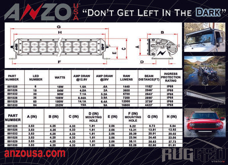 Rugged Vision, Off Road LED Light Bar, Rectangle, 6 in., 6 LEDs, High Output, . IP68 Rated, Can Be Submerged Up To 3 Meters. High Intensity LEDs. Polycarbonate lens. Black aluminum housing. Wiring Harness And Switch Included.