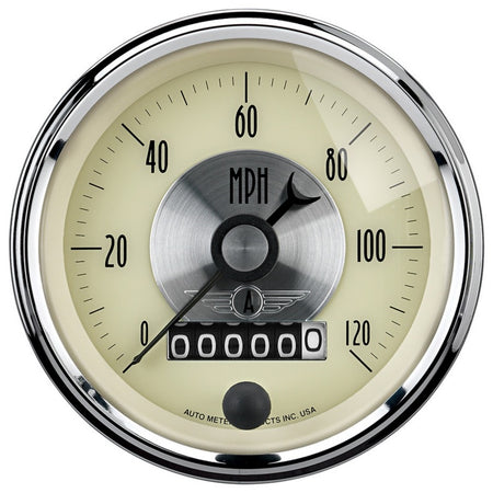AutoMeter Gauge Speedo 3-3/8in. 120MPH Elec. Program W/Wheel Odo Prestige Antq. Ivory