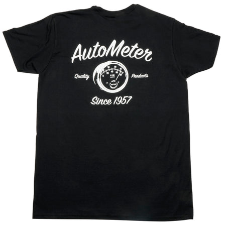 This Vintage Shirt Design From The Team At Autometer Remembers Their Roots. This 100% Cotton, Black Shirt With Sewn Fabric Hem Tag Detail Features A Screened White Original 1950S Logo Graphic On The Left Chest, And A Large Since 1957 White Screened Graphic On The Back Showcasing One Of The Companys Original Tachometer Designs