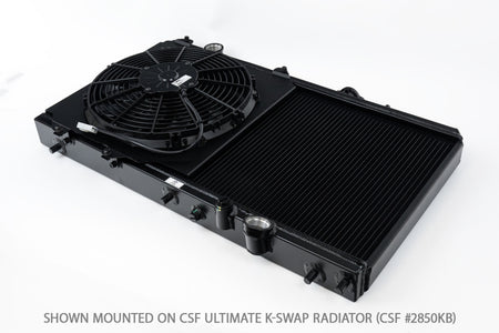 This optional all-aluminum fan shroud with 12" high-performance SPAL Fan is the perfect pairing for the CSF Ultimate K-Swap Radiators (CSF #2850K/2850KB). Made from high quality laser cut aluminum, the CSF Fan & Shroud kit keeps your K-Swapped Civic/Integra perfectly cool in style. The CSF #2858FB comes in a Black Finish for a high-end stealth look to match the CSF #2850KB. Also available in a Polished Finish (CSF #2858F) to match the CSF #2850K.