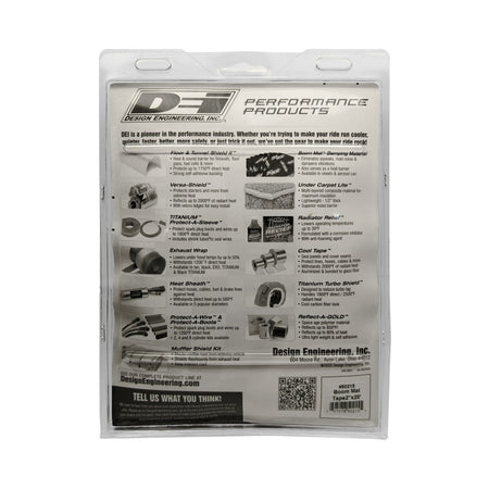 Boom Mat tape solves the problem of noise, vibration and rattling from any surface, and seals leaky seams and holes. Boom Mat Tape is a multi-purpose sound deadening material for use anywhere to help reduce road noise, sound system vibrations, rattles, dash board plastic-to-plastic chafing sounds, door panels, floor pans, deck lids and trunk area to name a few. It's ideal for any tool box and is handy as a preventative solution to aggravating sounds and road noise in the car, home, garage or shop. Boom Mat Tape has the same noise blocking and sound damping qualities as our Boom Mat damping material. It's for those hard to reach areas as well as for covering wire and cable harnesses running on or along the sides of floorboards. There are many in-home uses for Boom Mat Tape as well. Apply to the bottom of metal sinks to eliminate ringing, sump pump pipes from vibrating, heating & cooling ducts, seams in drain gutters, metal doors and under metal work benches and home stereo as examples. Simple to use, Boom Mat Tape requires no special tools. Easy-to-cut material easily conforms to a variety of shapes and those tough to reach areas. Also, Boom Mat Tape adheres to any metal, aluminum, fiberglass, plastic materials and many types of foam padding and fabrics. 2 In. wide by 20 Ft. long Easy to remove clear release liner Peel & stick application 2.5 mm thick butyl rubber with aluminum facing Great to have in any tool box Applications Include: Covering Seams & gaps Spot coverage for vibrations and rattling Patching leaks in RV roofs Cover seams, fix leaks Secure and protect cables, wires & lines