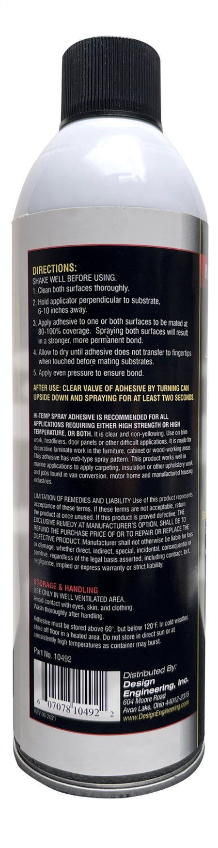 DEI's Improved Formula Hi-Temp Spray Adhesive is a very aggressive, high build pressure sensitive adhesive designed to bond porous substrates while maintaining a high level of tack. Useful for bonding for Foam, Fabric, Metals, Wood and of course DEI's heat and sound barrier materials. The spray is a web pattern for excellent coverage on all materials. California Compliant Low VOC SCAQMD Rule 1168 Very Aggressive, High Tack Adhesive Single Sided Application High Build Web Spray High Strength, long-term bond No ODS (ozone depleting substances) 13.3 OZ Spray Can * Hi-Temp Spray Adhesive is sold in a compressed aerosol container. Regulations restrict the air transport of flammable products (aerosols). If you are outside the continental USA and are interested in purchasing an aerosol based DEI product, please contact our offices for further information at 1-440-930-7940.