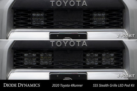 Features Bolt-on fitment compatible with Toyota 4Runner 2014-2024. Allows you to mount two to four SS5 pods behind the grille. Ultra-high intensity, with custom-engineered TIR optics. Selectable backlight color, with eight color options. Torture-tested, heavy-duty construction. SS5 Pods are assembled in the USA. Overview Perfect Fitment. The SS5 Stealth Grille LED Pod Kit compatible with Toyota 4Runner 2014-2024 from Diode Dynamics allows you to mount two to four Stage Series 5-inch LED pods behind the factory grille without interfering with the Safety Sense feature! These application-specific brackets were CAD-designed to bolt on using factory mounting points on the factory bumper. No cutting or drilling required! Mounting Options. This kit is available in a two or four-pod configuration which will not interfere with the Safety Sense feature. If your vehicle does not come equipped with Safety Sense feature, you can mount an additional fifth SS5 LED Pod Light on the center of the crossbar for even greater output! Designed for Performance. Featuring the highest output intensity of any 5-inch LED pod on the market, these auxiliary lamps have been designed for maximum functionality, with patented technology and custom-engineered TIR optics. The brackets included with this kit are made of durable powder-coated steel and have been precision tested to ensure your SS5 Pods will not vibrate while you're off-road. Selectable Backlight. The Stage Series 5-inch LED Pods included in the White kit feature a selectable backlight with eight different color options, perfect for an extra styling accent that you won't find on other LED pods. NOTE: The Yellow kit is only available with an Amber backlight color.
