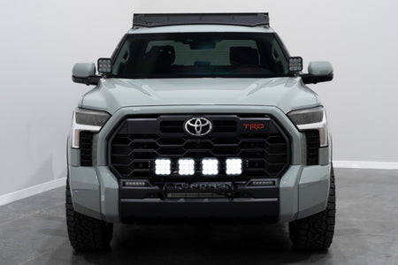 Features Bolt-on fitment compatible with Toyota Tundra 2022+. Allows you to mount a four-pod CrossLink lightbar across the grille. Ultra-high intensity, with custom-engineered TIR optics. Selectable backlight color, with eight color options. Torture-tested, heavy-duty construction. Utilizes existing mounting points for easy installation. Assembled in USA Overview Perfect Fitment. The Grille CrossLink Lightbar Kit compatible with Toyota Tundra 2022+ from Diode Dynamics allows you to mount four linked SS5 LED pods on the factory grille. These application-specific brackets were CAD-designed to bolt into place using factory mounting points on the bumper. No cutting or drilling required! Designed for Performance. Featuring the highest output intensity of any 5-inch LED pod on the market, these lamps have been designed for maximum functionality, with patented technology and custom-engineered TIR optics, all in a durable package. Selectable Backlight. The Stage Series 5inch LED Pods included in the White kit feature a selectable backlight with eight different color options, perfect for an extra styling accent that you won't find on other LED pods. Selecting your backlight color is easy - simply alternate the power on and off. There's no complicated programming with a controller! The SS5's backlight fully illuminates the TIR optic. NOTE: The Yellow kit is only available with an Amber backlight color. CrossLink. Our patent-pending CrossLink technology allows you to link up to eight SS5 pods together to create your own lightbar. The single-piece CNC aluminum link provides extreme rigidity, but is fully adjustable, for both straight and curved configurations.
