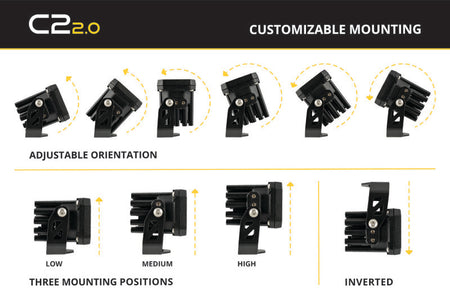 Overview. Introducing the Stage Series C2 2.0 LED Pod! The newly redesigned C2 2.0 packs even more power, light output, and versatility than the original C2 Pod. With its compact design, the C2 2.0 is a go-to for tight mounting spots. The new Max option delivers the highest output we’ve ever offered in a two-inch pod! Re-Engineered From the Inside Out. The C2 2.0 may look familiar, but under the hood, everything has changed. Dramatically improving thermal efficiency has resulted in higher power and light output. Choose Your Power Level. The C2 2.0 LED pod is now available in sport, pro, and max power levels. All options use high-intensity, automotive-grade LED emitters, and TIR optics for unmatched output. Focused Performance. Our patented TIR (Total Internal Reflection) optics in the C2 2.0 have been re-engineered for up to 120% more intensity and more usable light output compared to the C2 1.0. The TIR optics harness all of the light from the LED and direct it precisely where you need it. Each beam pattern has been fine-tuned for real-world conditions to perform even better than before. Backlight Functionality. These C2 2.0 LED Pods include a distinctive backlight feature, available in your choice of red or amber. The backlight fully illuminates the TIR optic, providing a unique and modern look. The red backlight is ideal for those looking to match OEM taillights or boost rear visibility, while the amber backlight is a great option for forward-facing applications to match OEM markers or add extra visibility. Customizable Mounting. The C2 2.0 LED pod features three mounting points to adjust the pod’s height. The revised mounting bracket also allows for even more adjustment to the angle of the pod for a more dialed-in setup.
