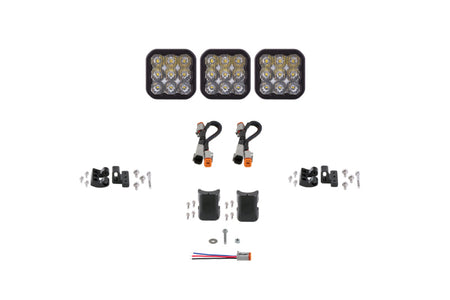 Features Three-pod 18.5-inch linked lightbar Engineered TIR (total internal reflection) optics Selectable backlight color, with eight color options Torture-tested, heavy-duty construction Ultra-high intensity: shines almost a mile away Assembled in USA Overview Using our patent-pending CrossLink technology, this kit links three SS5 LED pods together into a single lightbar. Featuring the highest output intensity of any 5-inch LED pod on the market, the LED pods included in this kit have been designed for maximum functionality, with custom-engineered TIR optics, all in a durable package. Focused. Traditional optics like reflectors or simple lenses lose light internally and to glare, so not all of the light shines on target. Instead, the custom-engineered TIR optic in the SS5 collects all of the light from the LED, and directs it only where you need it, drastically reducing glare and improving total efficiency. Selectable Backlight. The Stage Series 5inch LED Pods included in this kit feature a selectable backlight with eight different color options. Selecting your backlight color is easy - simply alternate the power on and off. There’s no complicated programming with a controller! The SS5's backlight fully illuminates the TIR optic, providing unique accent lighting that you won't find on other LED pods. NOTE: Due to the yellow lens, the Yellow kit is only available with an Amber backlight color. Simple connections. All SS5 LED pods feature a custom-molded DT type Deutsch-style connector. DT splitters are included in the kit to connect the pods together, along with a 6-inch pigtail with bare leads. For installation, you can wire yourself, use an off-the-shelf Deutsch DT sized wire harness, or use a Diode Dynamics wire harness.