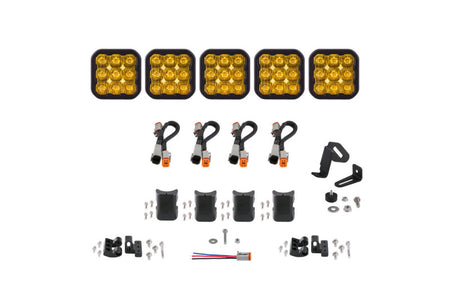 Features Five-pod 31.5-inch linked lightbar Engineered TIR (total internal reflection) optics Selectable backlight color, with eight color options Torture-tested, heavy-duty construction Ultra-high intensity: shines almost a mile away Assembled in USA Overview Using our patent-pending CrossLink technology, this kit links five SS5 LED pods together into a single lightbar. Featuring the highest output intensity of any 5-inch LED pod on the market, the LED pods included in this kit have been designed for maximum functionality, with custom-engineered TIR optics, all in a durable package. Focused. Traditional optics like reflectors or simple lenses lose light internally and to glare, so not all of the light shines on target. Instead, the custom-engineered TIR optic in the SS5 collects all of the light from the LED, and directs it only where you need it, drastically reducing glare and improving total efficiency. Selectable Backlight. The Stage Series 5inch LED Pods included in this kit feature a selectable backlight with eight different color options. Selecting your backlight color is easy - simply alternate the power on and off. There’s no complicated programming with a controller! The SS5's backlight fully illuminates the TIR optic, providing unique accent lighting that you won't find on other LED pods. NOTE: Due to the yellow lens, the Yellow kit is only available with an Amber backlight color. Simple connections. All SS5 LED pods feature a custom-molded DT type Deutsch-style connector. A DT wiring harness is included in the kit to connect the pods together, along with a 6-inch pigtail with bare leads. For installation, you can wire yourself, use an off-the-shelf Deutsch DT sized wire harness, or use a Diode Dynamics wire harness.