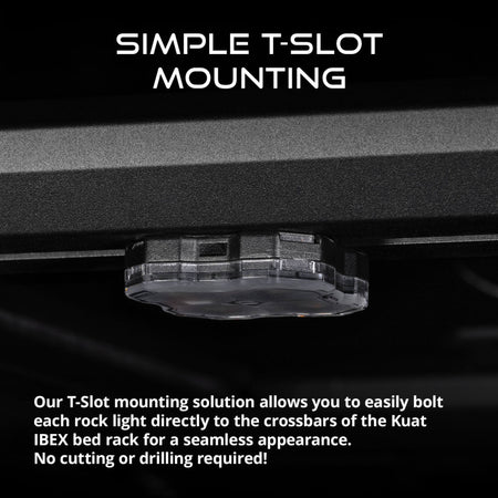 Features Allows you to mount four LED rock lights to the IBEX bed rack Significantly increased visibility with up to 4,000 lumen peak output Easily swap between cool white or amber output Seamlessly integrates with the crossbars for simple installation Engineered and Assembled in USA Overview Add significantly more light output to your truck bed at night with our Stage Series LED Bed Light Kit for the Kuat IBEX Bed Rack! This kit allows you to mount four Stage Series LED Rock Lights to the crossbars of your IBEX Bed Rack, giving you a huge increase in light output. Plus, you can easily swap between cool white and amber output thanks to the included lenses! With bolt-on installation and seamless integration, this kit is the perfect addition to any IBEX bed rack. Unmatched Light Output. By pairing optically engineered lenses with high-powered LEDs, the Stage Series Rock Lights included in this kit provide a significant increase in output. Choose Your Color This kit includes four White Diffused lenses and four Amber lenses, allowing you to choose the best color option for your vehicle. Whether you want a crisp, cool white light for maximum visibility or a softer amber to reduce glare, you can easily switch between lens options to suit your needs. Seamless Integration. The included T-Slot Nuts allow you to easily mount each rock light along the crossbars of the Kuat IBEX bed rack with a seamless appearance. The T-Taps allows you to connect to the factory bed light wiring, for simple everyday operation. Proven Reliability. We know that your bed lights will be put to the test, so you can rest assured that they have been designed for superior durability and extensively tested for long-term operation.