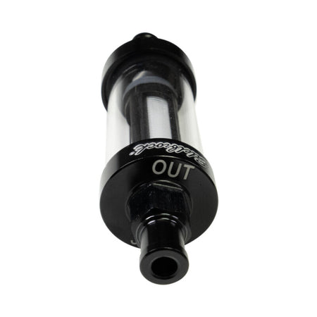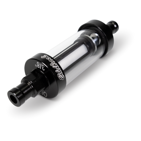Edelbrock Clear View Fuel Filter for 3/8" i.d. hose dresses up any carbureted car’s engine bay, providing a quick visual check of fuel flow and condition. Fully machined aluminum ends are laser inscribed with barbed inlet/outlet sizes and attractively E-coated black for durability. For use with rubber fuel lines rated up to 10psi. A serviceable 100-micron nylon filter element keeps dirt and debris from clogging up small passages in your carburetor. The filter element is easily replaced using kit PN 8749.