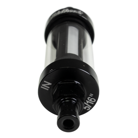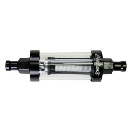 Edelbrock Clear View Fuel Filter for 5/16" I.D. Hose dresses up any carbureted car’s engine bay, providing a quick visual check of fuel flow and condition. Fully machined aluminum ends are laser inscribed with barbed inlet/outlet sizes and attractively E-coated black for durability. For use with rubber fuel lines rated up to 10psi. A serviceable 100-micron nylon filter element keeps dirt and debris from clogging up small passages in your carburetor. The filter element is easily replaced using kit PN 8749.