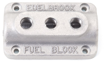 Edelbrock part #1285 vintage cast aluminum fuel block for triple carb applications is a great way to finish off your fuel system in your hot rod or custom vehicle. The Edelbrock vintage cast aluminum fuel block for triple carb applications features a single 3/8" NPT inlet and three 1/4" NPT outlets. Each fuel block has four holes for mounting to a fire wall and has a satin cast aluminum finish.