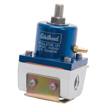 Edelbrock fuel pressure regulators #174042 are machined from aircraft quality aluminum for those who demand the best. These EFI fuel pressure regulators have an internal diaphragm made of fluorosilicone to ensure high temperature protection resulting in an extended life. They are compatible with all grades of gasoline, ethanol, methanol and E85 fuels. These regulators will hold fuel system pressure for at least 20 minutes after pump shutdown. Mounting bracket and hardware are included. Each regulator features a vacuum/boost compensating port for a supercharger, turbo or intake manifold vacuum connection.