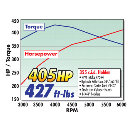 Edelbrock part #7594 RPM Air-Gap intake manifold is designed for street and high performance 308-383 c.i.d. Holden V8 engines that utilize the 1988-98 Holden VN cylinder heads. This RPM Air-Gap manifold is a dual-plane design that is tuned for both excellent throttle response and greater horsepower from 1500 to 6500 rpm. This manifold has been designed to fit both stock 1988-1998 EFI style heads and the Edelbrock Holden VN RPM cylinder heads.