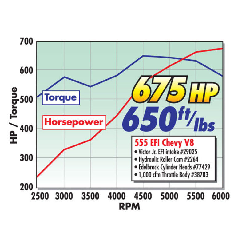 Edelbrock part #29025 Victor Jr. 454-R EFI intake manifold is designed for competition 396-502 big-block Chevy engines with rectangular-port cylinder heads. It features extended runner dividers, smaller plenum chambers and unique runner design for better 60 foot times and max power from 3500 to 7500 rpm. These intake manifolds are especially suited to 502 c.i.d. and smaller competition engines. The Edelbrock Victor Jr. 454-R EFI intake manifold will fit Edelbrock Victor race cylinder heads #77609 and Victor 24 degree #77409, #77459, #77429, #77479 and #77489.