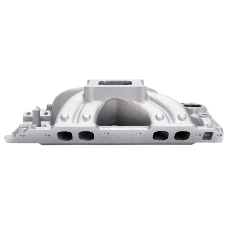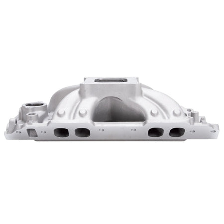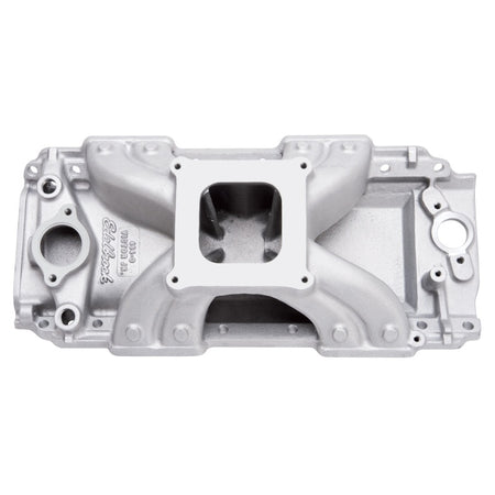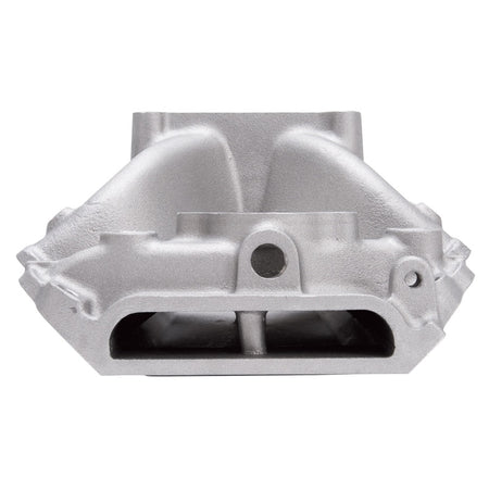 Edelbrock part #2904 Victor Jr. 454-O intake manifold is designed for competition 396-502 big-block Chevys with large oval-port heads (1975 & earlier). Features include extended runner dividers, smaller plenum chambers and unique runner design for better 60 foot times and max power from 3500 to 7500 rpm. This manifold is especially suited to 502 c.i.d. and smaller competition engines. This intake manifold is a single plane 4150 flange competition manifold designed to fit standard deck blocks from 1965 to present. It is designed to be matched with our Edelbrock/Musi Victor 24-degree Pro-Port CNC heads #61419 or #61409 for 950+ hp out-of-the-box potential!