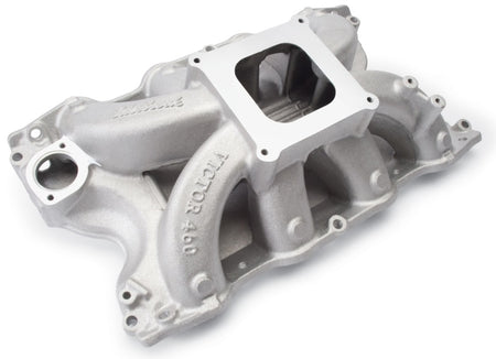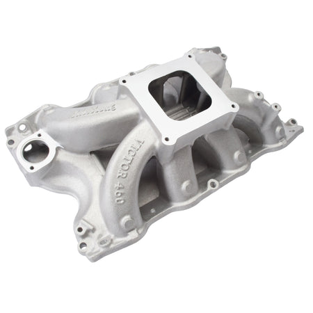 Edelbrock part #2966 Victor 460 intake manifold is designed for Ford 429/460 competition engines using Cobra-Jet cast iron, SVO Cobra-Jet aluminum (M-6049-A429), or the Edelbrock 460 CJ aluminum heads. This intake manifold is ideal for drag racing (Super Stock, Super Gas, Super Comp, Brackets, etc.), marine or any application requiring maximum power up to 8000 rpm. Standard 429/460 cast iron heads will require port matching of the head to fit manifold. Port exit size at head is 1.88" x 2.16" with enough extra material to open it up to the cast iron Cobra-Jet heads. Will not fit 1988 and later models.