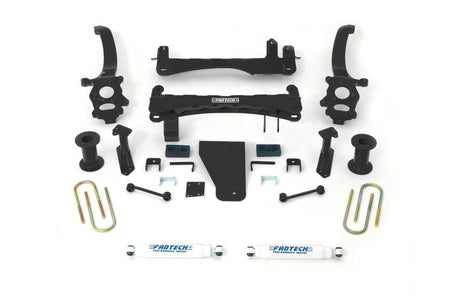 This 6" Basic system for the Nissan Titan features Fabtech's proven IFS technology with extended length ductile iron steering knuckles for proper factory electronic stability control functionality. Heavy duty 1/4" thick steel lower control arm crossmembers provide superior ground clearance while the integrated front differential skid plate adds protection to the drivetrain. Rear lift is accomplished with a block and u bolt configuration. The Basic System includes front coilover spacers that utilize the factory Coilover shocks for a stock like ride characteristic.