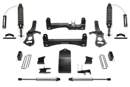 The Chevy Trail Boss and GMC AT4 both have a factory 2in lift compared to other GM 1500 trucks of the same year model. Fabtech's suspension system for these two trucks provide a 4in lift height on top of the factory 2in lift for clearance of 35in tall tires. Once a Trail Boss or AT4 is lifted with a Fabtech 4in system, the truck will sit at the same height as a 1500 with a 6in suspension and 35in tires. The near stock track width keeps the tires under the fenders for a clean appearance. Fabtech's proprietary steering knuckle geometry provides excellent lock to lock turning radius to maneuver in tight spots. Heavy duty 1/4in thick steel crossmembers feature OE style alignment cam pins that utilize the factory cams for easy adjustment. Triple front diff mounts reposition the differential for vibration free operation at high speed. The stainless steel Dirt Logic 2.5 Coilovers replace the Trail Boss or AT4 coilover with an outstanding ride quality both on and offroad. They are designed for aggressive offroad use yet have a supple on road feel. Rear Dirt Logic 2.25 shocks aid in damping the vehicle for a balanced ride. Rear lift is accomplished by removing the factory 2in block and replacing it with a 5in block and u-bolt system. Fabtech has addressed all aspects of the Trail Boss suspension for full suspension travel with lock to lock steering without over cycling. Comes with a free 5 year 60,000 mile Powertrain Warranty. CROSSMEMBERS: 1/4in thick steel lower control arm Crossmembers are arched for maximum ground clearance. The welded box design of these Crossmembers provides additional strength to the front suspension. Retains factory alignment cams for easy adjustment. STEERING KNUCKLES: Fabtech's extended length ductile iron Steering Knuckles provide zero bump steer throughout the suspension travel. This provides an enhanced driver experience compared to stock. Near stock track width keeps the tires under the fenders for a clean appearance. TIE RODS: Oversized tie ro