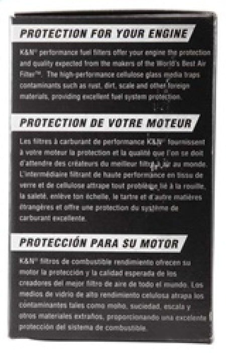 K&N Performance Fuel Filters are built for high flow rates and capacity while they provide outstanding filtration. They have a high strength carbon steel housing and a high performance rolled seam that exceeds OEM pressure requirements. Their high performance cellulose glass media traps contaminants such as rust, dirt, scale and other foreign materials.