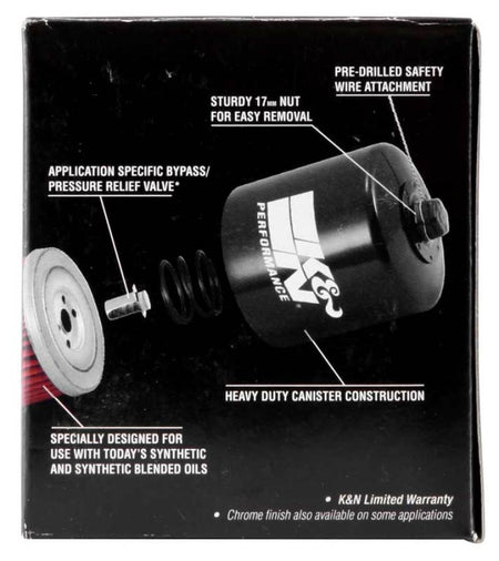 K&N premium oil filters for powersports vehicles utilize an innovative, highly efficient synthetic-blend filtration media designed to be compatible with synthetic, petroleum-based, and blended oils, including the high concentrations of synthetic racing oils. The heavy-duty canister is engineered to be exceptionally durable, and a 17mm welded hex nut can be used for quick and easy filter removal. Engineered to support exceptionally high flow rates while providing outstanding protection from harmful engine contaminants, each filter is specifically designed to withstand the service intervals recommended by vehicle manufacturers, and is protected by the K&N 1-Year Limited Warranty.