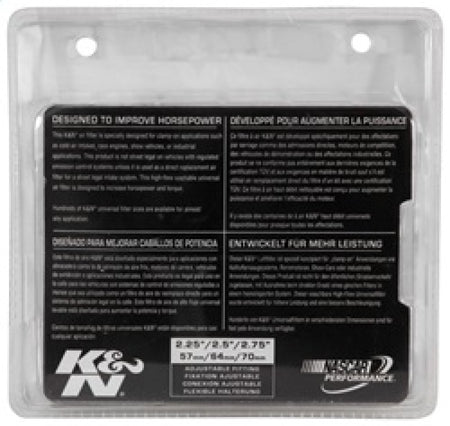 K&N adjustable fitting Universal Air Filters are made with flange inserts which adjust the filter's flange to one of three inside flange diameters. The flange on these filters is made with ultra-strong molded pliable rubber which absorbs vibration and allows for secure attachment. K&N clamp-on universal air filters are washable and reusable.
