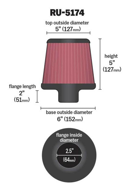 K&N Universal Rubber Filter-Round Tapered 2.5in Flange ID x 6in Base OD x 5in Top OD x 5in Height