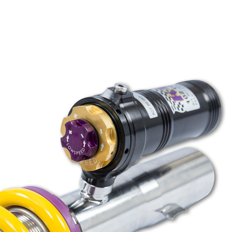Using the Nordschleife as it's testing grounds and the 7-post rig, KW developed it's V4 Clubsport coilover kit. Wheel loads, vehicle weight and chassis reinforcements (increased body stiffness) can all be taken into consideration with Adjustment -capabilities of the V4 Clubsport. The KW Clubsport coilovers combine KW's high-end racing technology -with maintenance-free KW OEM quality components. Designed to provide you the ideal product to utilize the full potential of your sports car during autocross, track days, high performance drivers education (HPDE) courses, club racing, and is tested rigorously on race tracks such as the Nurburgring Nordschleife. Race teams rely on KW's racing expertise and experience for their vehicle setup. This same championship winning pedigree is mirrored in the development of each one of the KW Clubsport coilover systems. Similar to the KW Competition suspension used in international motorsports, the KW V4 Clubsport coilover kit allows fine tuning of the compression damping separately in the low-speed and high-speed range. The click adjustments of the TVCLH-A valve technology -ake for easy Adjustment -directly on the reservoir. You can modify the low-speed compression damping with 6 precise clicks with the purple low speed Adjustment -ial and directly beneath it the golden Adjustment -heel provides an additional 14 precise clicks of high speed compression adjustment. In addition, the TVR-A technology -provides 16 clicks to noticeably adjust the rebound damping independently of the compression damping. If you would like to adjust the KW V4 Clubsport coilover kit it can easily be adjusted for more comfort or to an alternative setup for a new race track. The KW V4 Clubsport benefits from the same motorsports technology -hat has proven its endurance with multiple overall wins at the ADAC Zurich 24h Nurburgring race.