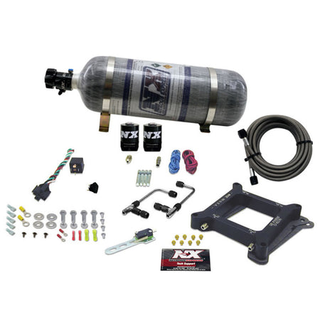 The Gemini plate system is the most technically advanced single stage plate ever designed. The unique direct-port pattern assures you perfect nitrous-fuel distribution. It solves problems commonly found on single plane manifolds, particularly small and big block Fords. This new innovation provides superior distribution and outstanding atomization. With no spray bars to sag, split, block airflow, or damage this is truly the 'Next Generation' in nitrous plate technology. This Stage 6 system includes jetting for 50, 100, 150, 200, 250 & 300HP and includes a COMPOSITE nitrous bottle, limited lifetime warranty Lightning solenoids, heavy duty 40 amp relay, stainless bottle brackets, and extra 4AN long supply line (Race Hose). Fits standard 4150 flange carburetors.