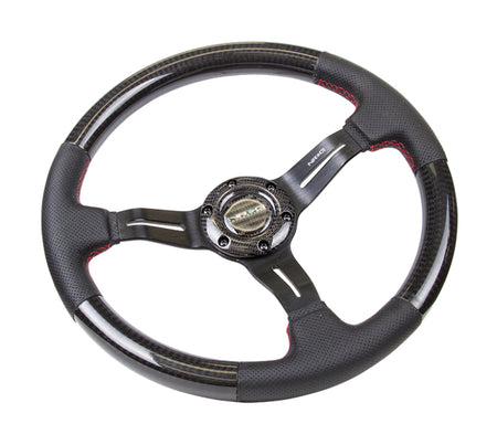 NRG Carbon Fiber Steering Wheel (350mm /1.5in. Deep) Leather Trim w/Red Stitch & Slit Cutout Spokes