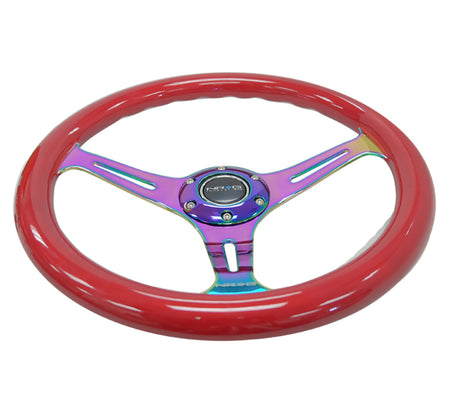 NRG Classic Wood Grain Steering Wheel (350mm) Red Grip w/Neochrome 3-Spoke Center