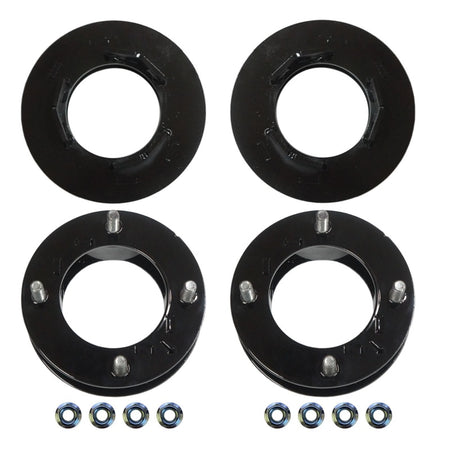 Conquer your exciting daily highway adventures and the trail's toughest terrains with a bold new attitude. The Toyota Tundra sits lower in the front than the rear. This factory rake, nose-down stance is very evident. The coil spring rear has a comfortable, but soft spring rate. This Skyjacker Metal Spacer Kit will raise the suspension clearance of your Tundra (2.5-Inch Front & 1.0-Inch Rear). Raising the suspension clearance of your Tundra gives you the freedom to add larger, more aggressive 295/60R20 tires for greater ground clearance. Added ground clearance will prevent you from scrubbing on turns and from bottoming out on the bumps, rocks, off-road debris or even a steep driveway. Retain your Tundra factory tuned performance front struts and rear coil springs by utilizing top mounted spacers to elevate the stance. Skyjacker's 1-piece top mount spacers have a strong tab-and-slot interlocked design. Engineered with camber offsets, front strut spacers integrate smoothly with OEM suspension geometry and function perfectly allowing the CV axles to operate within limits of OEM upper and lower control arms. (Front OEM strut stays assembled, so there is no need for a strut spring compressor.) Rear coil spring spacers fit into the OEM upper spring mount to gain a better level stance and function perfectly with the Tundra's factory coil springs. All steel metal construction (0.1875mm - 3/16 in.) with modern exact CNC laser cuts, CNC bends and breaks, CNC machining and expert welds. They are powder coated to provide an extremely durable protective barrier to prevent corrosion. Comes complete with quality grade mounting hardware. This Skyjacker Metal Spacer Kit is a great way to compensate for added front weight of accessories like a winch, off-road bumper or combination of both. Increase capabilities for added weight of an off-road rear bumper, toolbox, bed rack or other overland accessories.