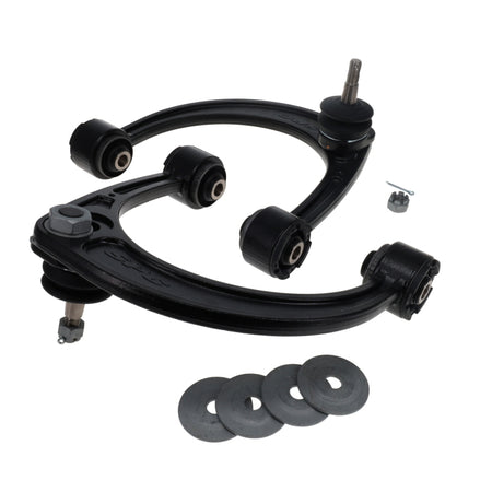 Designed, engineered, tested, and assembled in Colorado, SPC Performance adjustable upper control arms are loaded with impressive features. Improve suspension travel, handling, and tire wear while centering the tire in the wheel well for maximum clearance needed for oversized tires. Now equipped with maintenance-free ball joints and free-pivoting xAxis™ sealed flex joints in bonded rubber sleeves, for correction of alignment angles and restoration of factory ride quality. A Forged steel design provides the strength and durability needed for the most demanding environments. SPC adjustable control arms have improved clearance to get around the spring bucket and a full 80° of articulation in the ball joint. When trucks are lifted, caster and camber angles are affected that can lead to poor handling characteristics such as ‘wandering’. SPC control arms have positive caster built-in for lifted vehicles to restore alignment angles and drivability. The patented ball joint design allows the tire to be positioned correctly in the wheel well and additional adjustment in the OE lower arms can maximize placement for oversized tires to avoid fender trimming. If replacement lower adjustment cams are needed, see part #25440 or #25435 depending on year. Sold as pairs. US Patent No. 7,513,514.