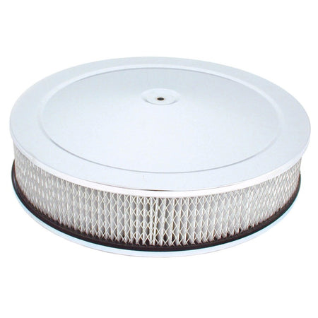 Spectre's Chrome Round Air Cleaners are designed to fit carburetors and throttle body injection assemblies with a 5-1/8 inch inlet. Engineered to maximize air flow, this assembly includes a round 14 inch by 3 inch Spectre HPR paper air filter with flame resistant media. The triple chrome-plated filter lid is fabricated from high quality steel featuring a smooth design. Designed to increase hood clearance, the recessed base lowers the air cleaner 1-1/4 inch.