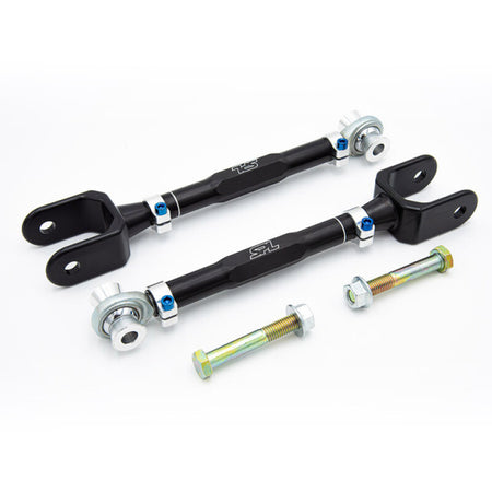 SPL rear toe arms provide a large range of adjustment to properly correct the rear toe angle and increase the vehicle's overall stability by reducing unwanted toe angle shift from bushing deflection, especially with high cornering or braking loads and over bumps. The result is better handling, driving feel, and improved tire life.BenefitsLarge Toe Adjustment RangeImproved Tire Wear, Stability, and HandlingOn-Car Adjustable with No Jam NutsLightweight, High Strength ConstructionMaintenance-Free, US Made, PTFE-Lined FK Rod EndsFixes Slipping Issue with OEM EccentricsEccentric Lockout Kit IncludedEccentric bolts are prone to slipping with increased cornering loads. To solve this our toe eccentric lockout kit is included in this toe arm kit (RTAEL), which replaces the OEM Hyundai eccentric bolts with lockplates and non-eccentric bolts to lock down your alignment.Easy, On-Car AdjustmentsThe anodized 2024-T351 aluminum arm uses opposing thread patterns (RH and LH) to allow you to adjust the toe while it is still installed. Simply loosen the aluminum clamps with a 5/32" hex key, elongate or shorten the arm by turning, then tighten the titanium cap screws. That's it, no need for fumbling wrenches trying to tighten a jam nut while you keep the arm the exact same length.Materials2024-T351 aluminum hollow arm (anodized black)6061-T6 aluminum clamps6061-T6 aluminum clevisTitanium 1/4-20 socket head bolts (anodized blue)FK PTFE-lined rod ends (F1 spec, self-cleaning)Suitable for all uses, from daily driver to race car.made-in-usa.png
