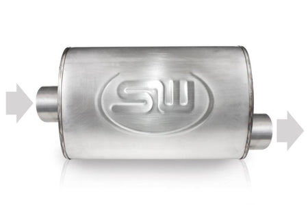 Turbo S-tube muffler, Made from 304 stainless steel for maximum corrosion resistance. This muffler has 2-1/4" ID center inlet and a 2-1/4" OD offset outlet with a 2-1/4" core and shell size 4" x 8" x 14" with an overall length of 18" with a mill finish. Stainless Works is the only manufacturer to make the body, core, and packing out of 304 stainless steel. Exclusive louvered core creates a sweet "Street Rod" deep tone that is very aggressive. These are TIG welded for strength and durability. These kits come with a lifetime warranty and proudly made in the USA.