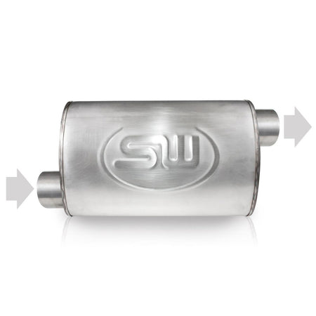 Turbo S-tube muffler, Made from 304 stainless steel for maximum corrosion resistance. This muffler has 2-1/4" ID offset inlet and a 2-1/4" OD offset outlet opposite side with a 2-1/4" core and shell size 4" x 8" x 14" with an overall length of 18" with a mill finish. Stainless Works is the only manufacturer to make the body, core, and packing out of 304 stainless steel. Exclusive louvered core creates a sweet "Street Rod" deep tone that is very aggressive. These are TIG welded for strength and durability. These kits come with a lifetime warranty and proudly made in the USA.