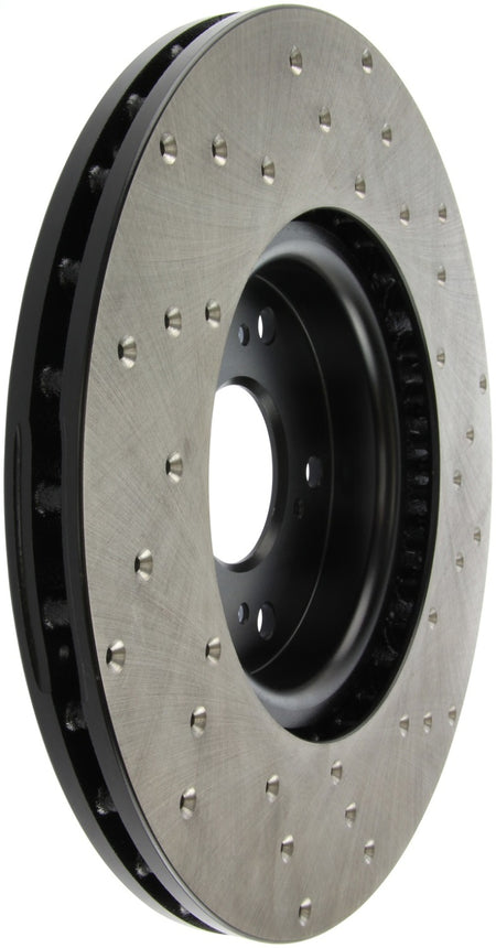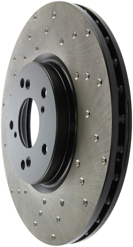 StopTech Drilled Sport Rotors are 1-piece direct replacement brake discs for factory brake systems and stock calipers that look great behind your wheels – and offer significantly improved braking performance. The unique cross-drilling aids with heat and brake dust dispersal; prevents glazing of the pads; adds bite and improves wet and dry braking performance. Built to last; the black e-coating provides protection from corrosion and the high carbon metallurgy (in most applications) offers quieter operation; better crack resistance and increased performance.