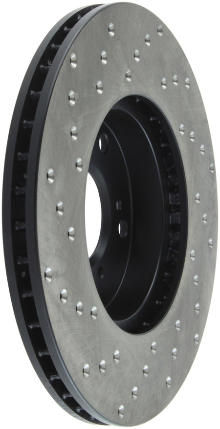 StopTech Drilled Sport Rotors are 1-piece direct replacement brake discs for factory brake systems and stock calipers that look great behind your wheels – and offer significantly improved braking performance. The unique cross-drilling aids with heat and brake dust dispersal; prevents glazing of the pads; adds bite and improves wet and dry braking performance. Built to last; the black e-coating provides protection from corrosion and the high carbon metallurgy (in most applications) offers quieter operation; better crack resistance and increased performance.