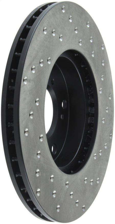 StopTech Drilled Sport Rotors are 1-piece direct replacement brake discs for factory brake systems and stock calipers that look great behind your wheels – and offer significantly improved braking performance. The unique cross-drilling aids with heat and brake dust dispersal; prevents glazing of the pads; adds bite and improves wet and dry braking performance. Built to last; the black e-coating provides protection from corrosion and the high carbon metallurgy (in most applications) offers quieter operation; better crack resistance and increased performance.