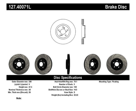 StopTech Drilled and Slotted Sport Rotors are 1-piece direct replacement brake discs for factory brake systems and stock calipers that look great behind your wheels – and offer significantly improved braking performance. The unique cross-drilling and slotting aids with heat and brake dust dispersal; prevents glazing of the pads; adds bite and improves wet and dry braking performance. Built to last; the black e-coating provides protection from corrosion and the high carbon metallurgy (in most applications) offers quieter operation; better crack resistance and increased performance.
