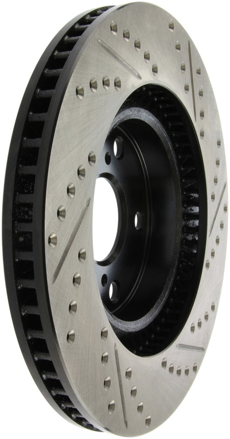 StopTech Drilled and Slotted Sport Rotors are 1-piece direct replacement brake discs for factory brake systems and stock calipers that look great behind your wheels – and offer significantly improved braking performance. The unique cross-drilling and slotting aids with heat and brake dust dispersal; prevents glazing of the pads; adds bite and improves wet and dry braking performance. Built to last; the black e-coating provides protection from corrosion and the high carbon metallurgy (in most applications) offers quieter operation; better crack resistance and increased performance.
